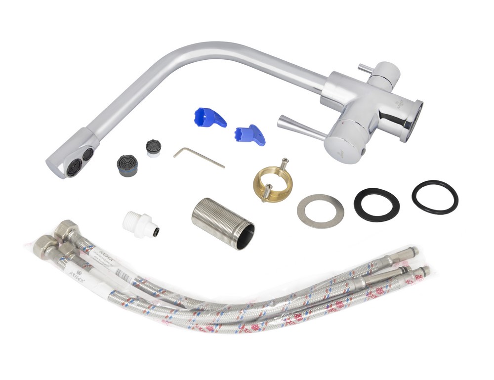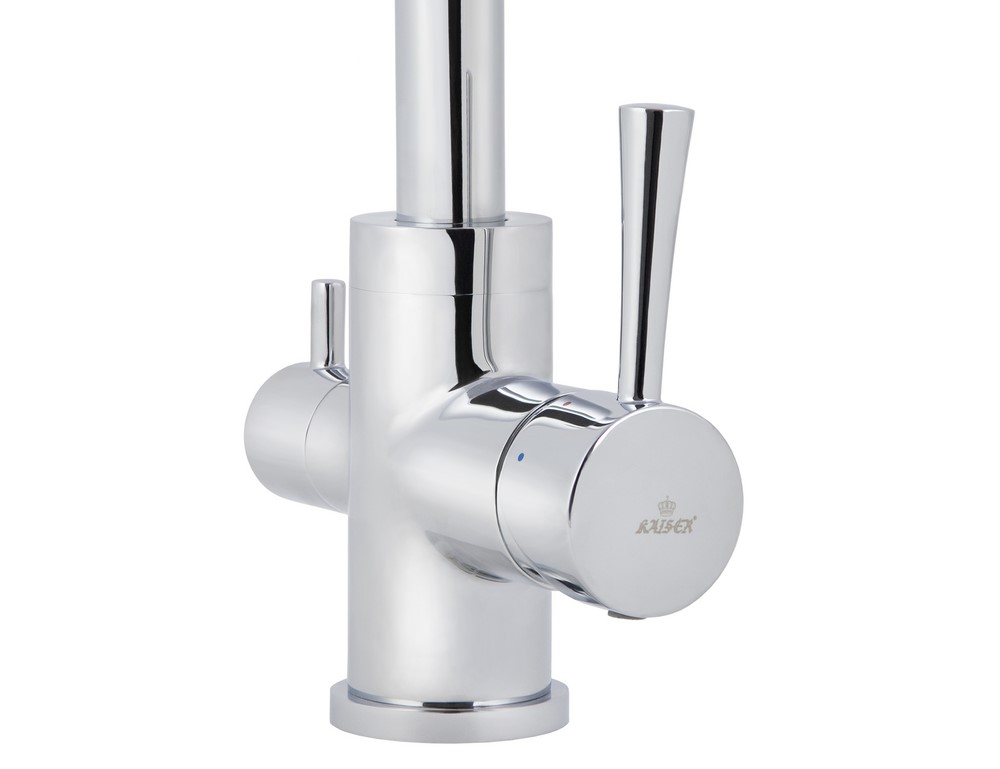 Смеситель Kaiser 26044 из коллекции Merkur с подключением под фильтр. Для подачи питьевой воды на корпусе смесителя размещен рычаг. Преимущество совмещенных смесителей заключается в том, что не нужно делать дополнительных отверстий на мойке и устанавливать отдельный кран для питьевой воды.