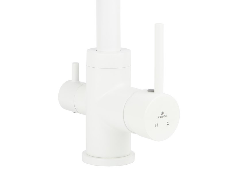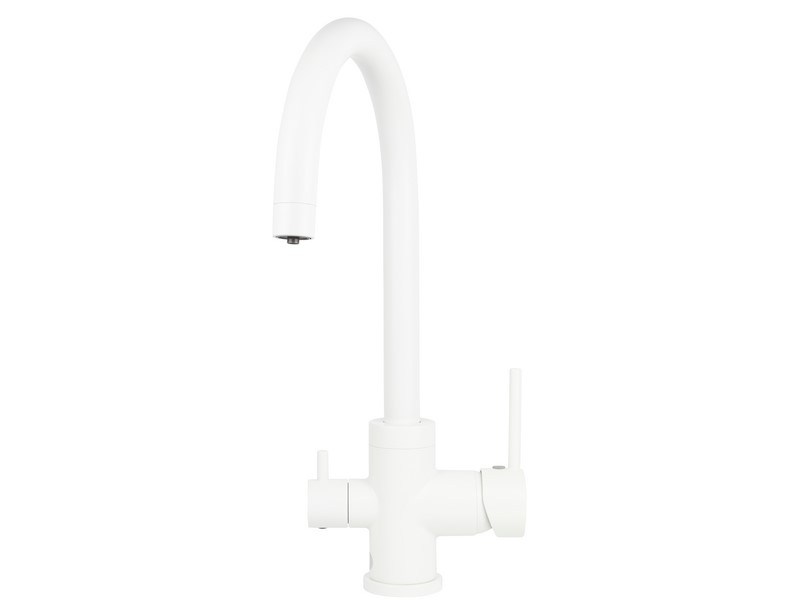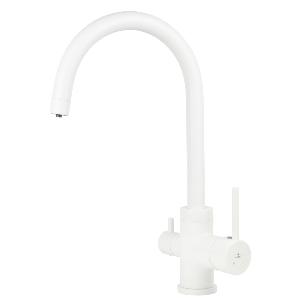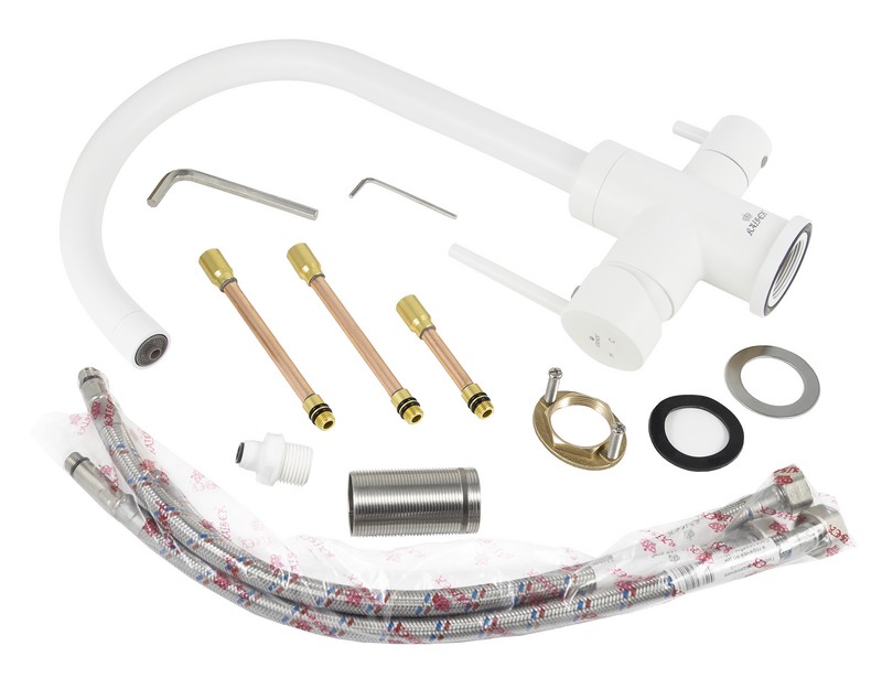 Смеситель Kaiser 26744-4 из коллекции Merkur с подключением под фильтр. Смеситель имеет сдвоенный аэратор, внутри излива проходит трубка для фильтрованной воды, что исключает возможность смешивания с проточной водой. Для подачи питьевой воды на корпусе смесителя размещен рычаг. Преимущество совмещенных смесителей заключается в том, что не нужно делать дополнительных отверстий на мойке и устанавливать отдельный кран для питьевой воды.