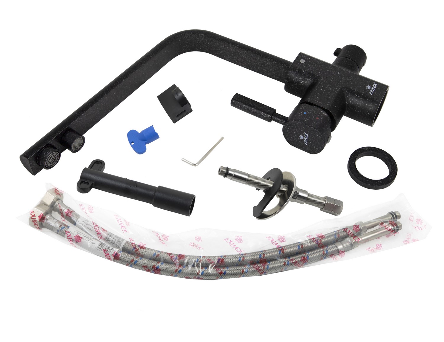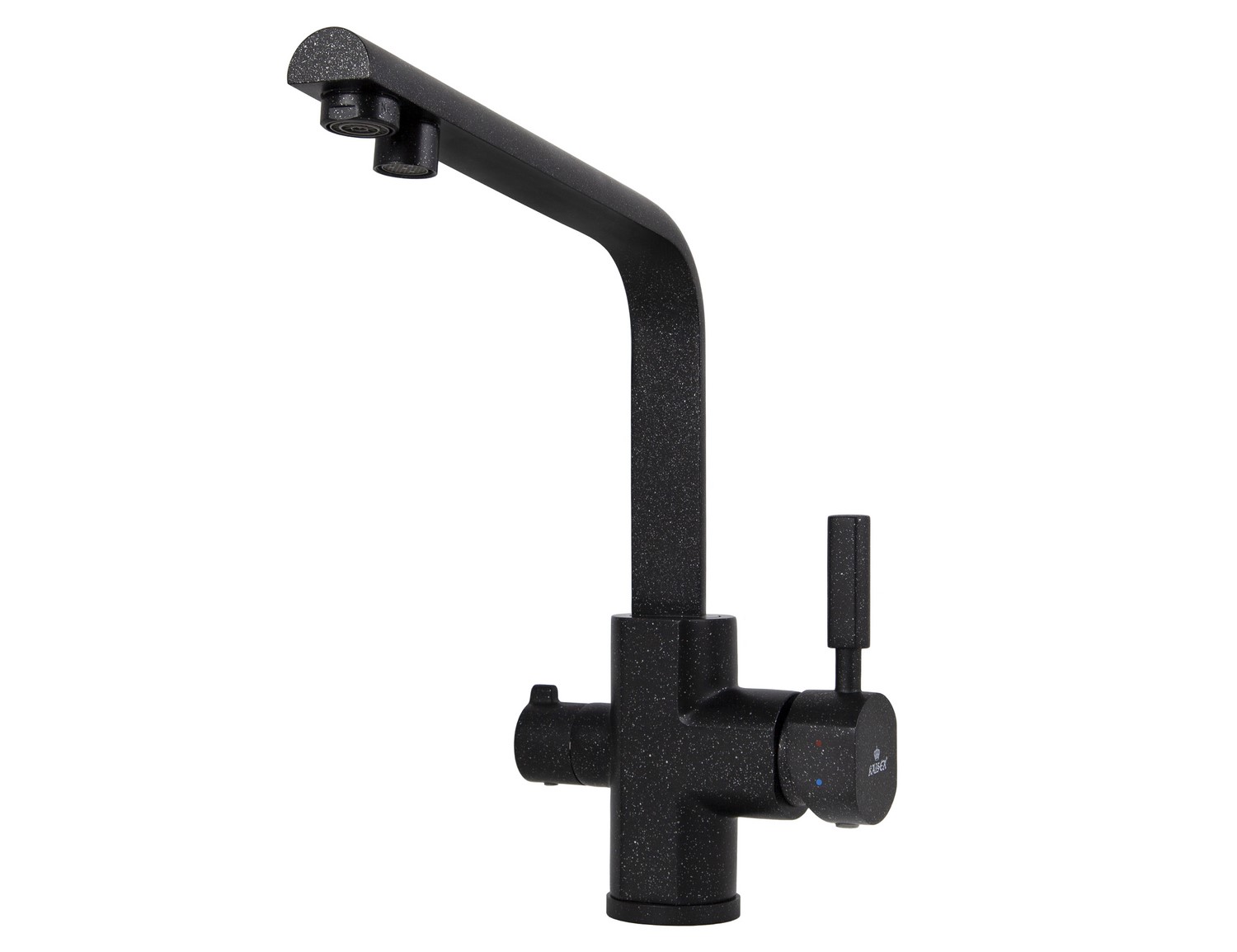 Смеситель Kaiser 40144-2 из коллекции Decor с подключением под фильтр. Для подачи питьевой воды на корпусе смесителя размещен рычаг. Смеситель имеет два аэратора для раздельного выхода проточной и фильтрованной воды, что исключает их смешивания. Преимущество совмещенных смесителей заключается в том, что не нужно делать дополнительных отверстий на мойке и устанавливать отдельный кран для питьевой воды.