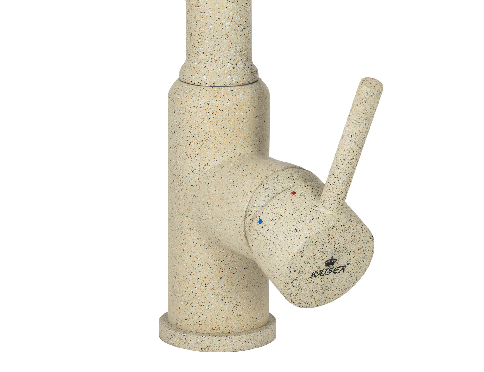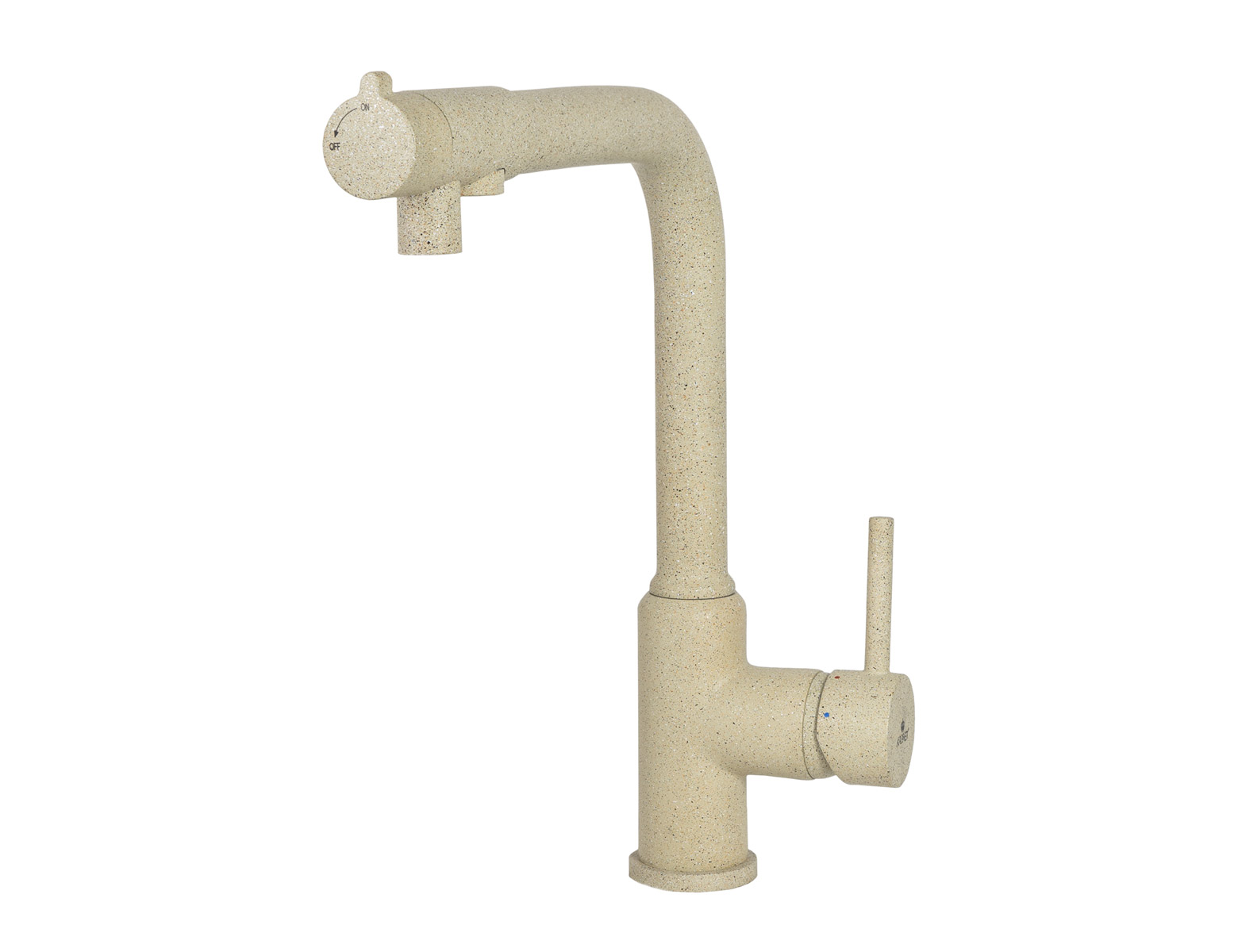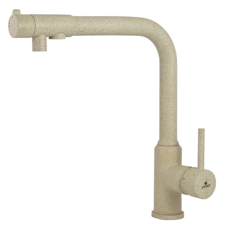 Смеситель Kaiser 13044-16 из коллекции Teka совмещен с краном для питьевой воды. Особенность модели заключается в сдвоенном изливе, внутри которого проходят две трубки, для питьевой и проточной воды. Два аэратора для раздельного выхода проточной и фильтрованной воды, исключают возможность их смешивания. Подача питьевой воды осуществляется переключателем на конце излива. Преимущество совмещенных смесителей заключается в том, что не нужно делать дополнительных отверстий на мойке и устанавливать отдельный кран для питьевой воды.