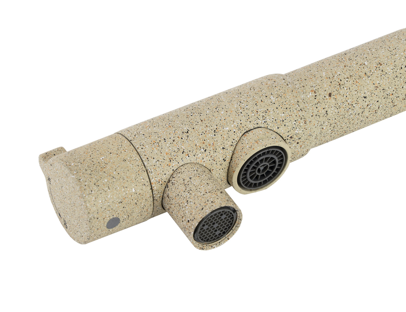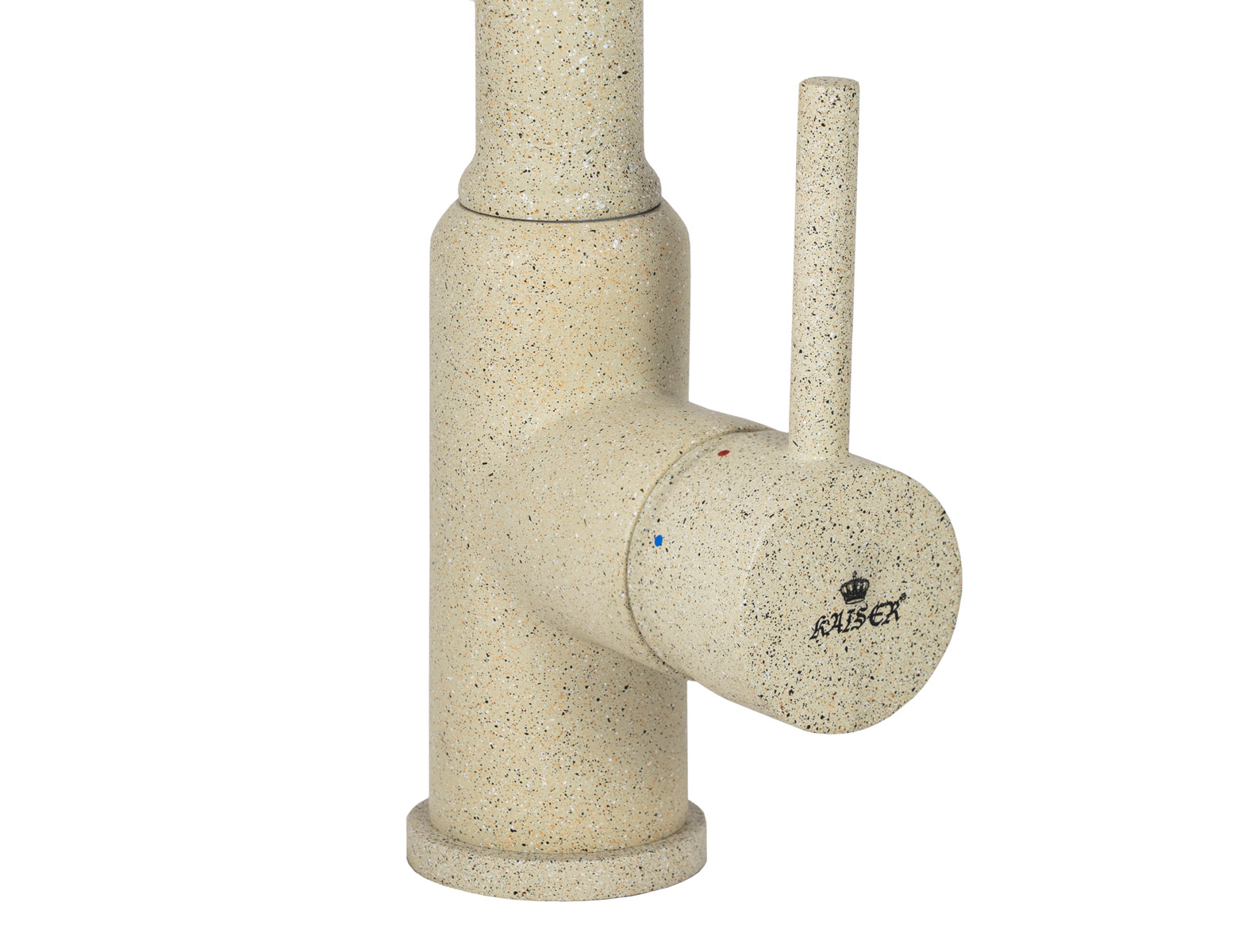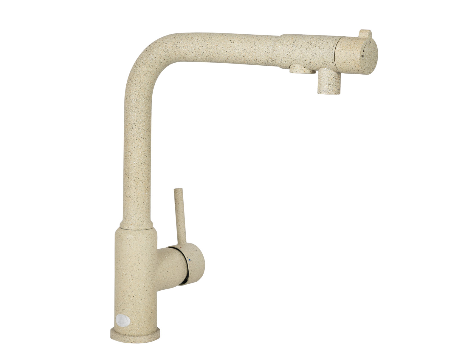 Смеситель Kaiser 13044-16 из коллекции Teka совмещен с краном для питьевой воды. Особенность модели заключается в сдвоенном изливе, внутри которого проходят две трубки, для питьевой и проточной воды. Два аэратора для раздельного выхода проточной и фильтрованной воды, исключают возможность их смешивания. Подача питьевой воды осуществляется переключателем на конце излива. Преимущество совмещенных смесителей заключается в том, что не нужно делать дополнительных отверстий на мойке и устанавливать отдельный кран для питьевой воды.