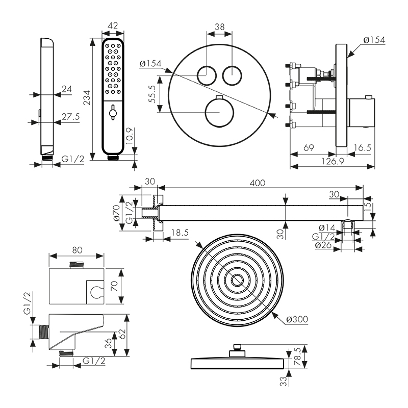 смеситель скрытого монтажа, скрытая монтажная часть, кронштейн, лейки, настенное соединение шланга с поворотным держателем, шланг, крепления