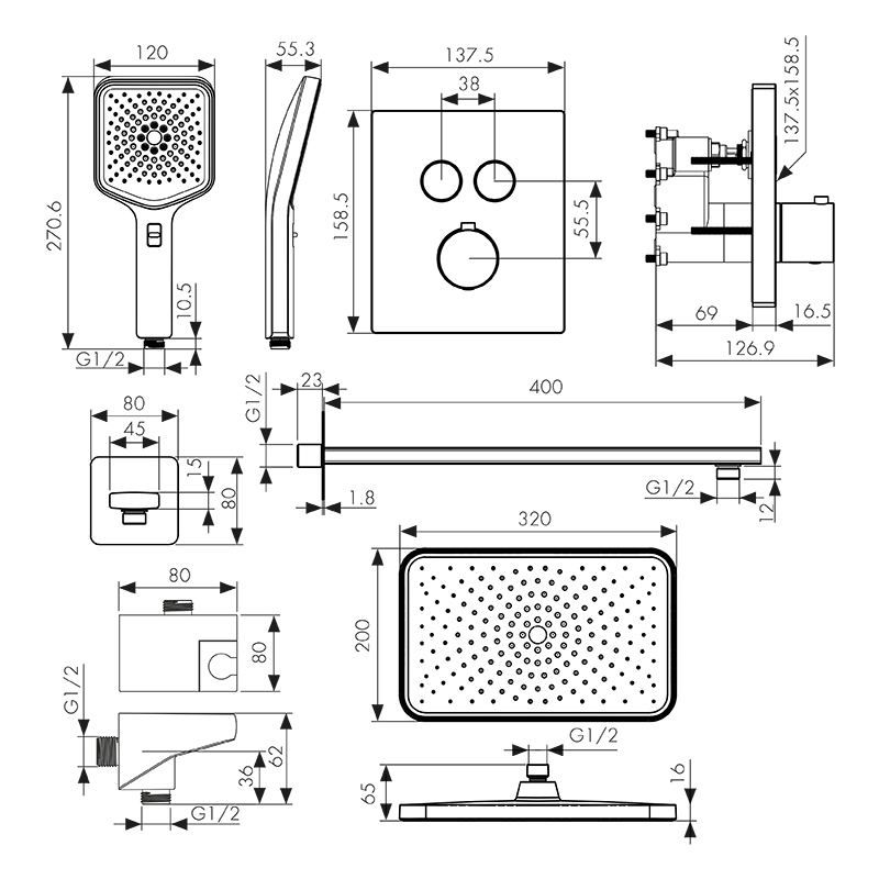 смеситель скрытого монтажа, скрытая монтажная часть, кронштейн, лейки, настенное соединение шланга с поворотным держателем, шланг, крепления