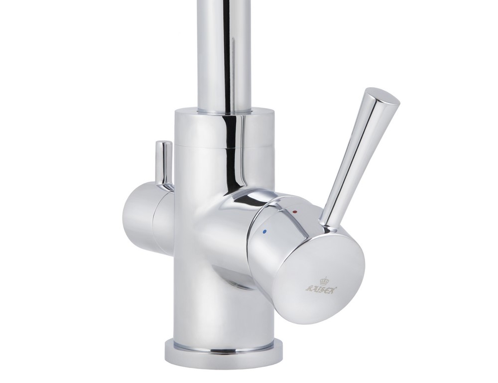 Смеситель Kaiser 26044 из коллекции Merkur с подключением под фильтр. Для подачи питьевой воды на корпусе смесителя размещен рычаг. Преимущество совмещенных смесителей заключается в том, что не нужно делать дополнительных отверстий на мойке и устанавливать отдельный кран для питьевой воды.