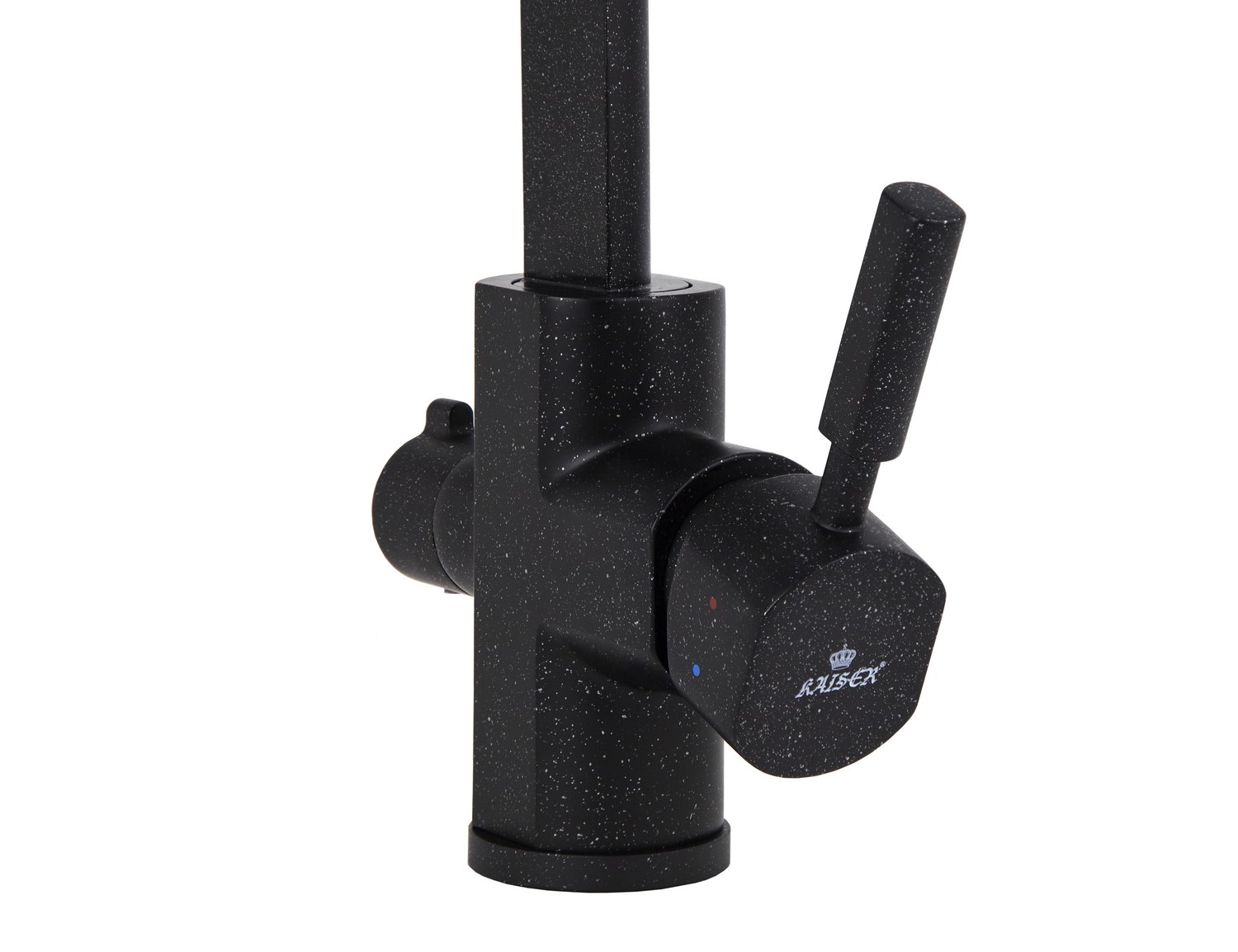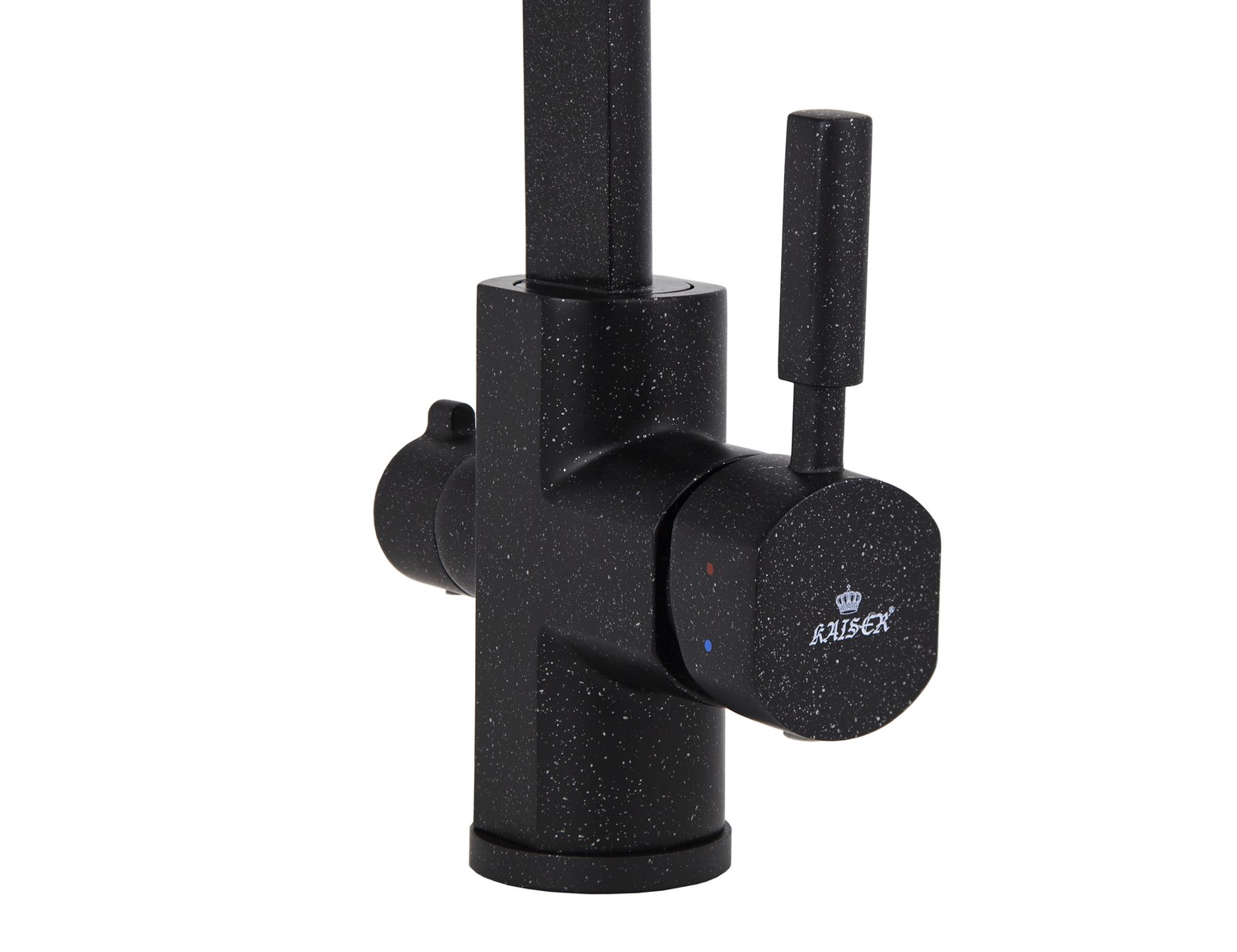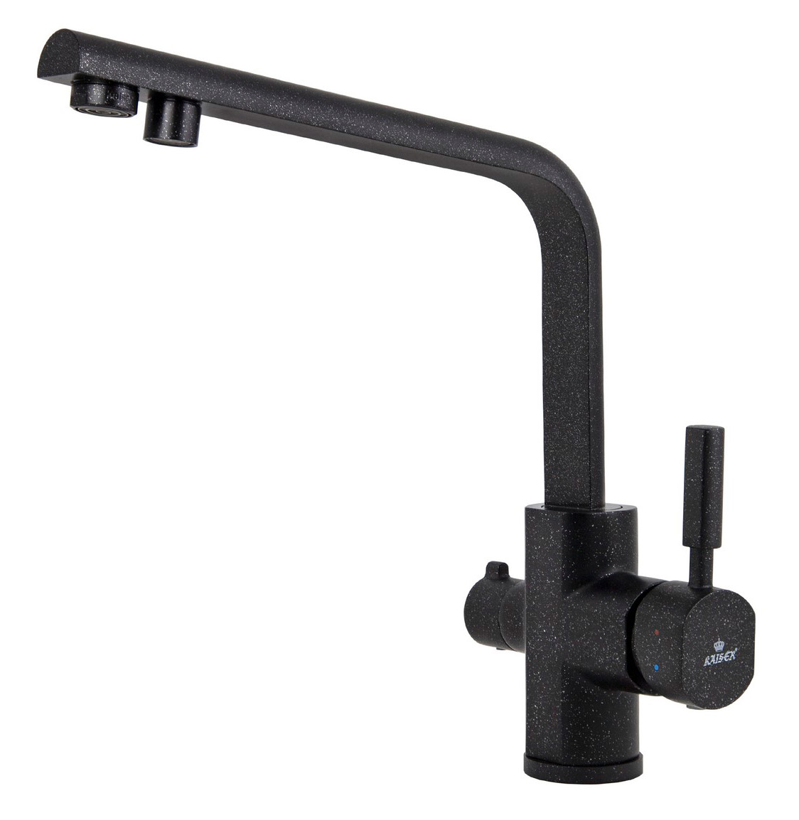 Смеситель Kaiser 40144-2 из коллекции Decor с подключением под фильтр. Для подачи питьевой воды на корпусе смесителя размещен рычаг. Смеситель имеет два аэратора для раздельного выхода проточной и фильтрованной воды, что исключает их смешивания. Преимущество совмещенных смесителей заключается в том, что не нужно делать дополнительных отверстий на мойке и устанавливать отдельный кран для питьевой воды.